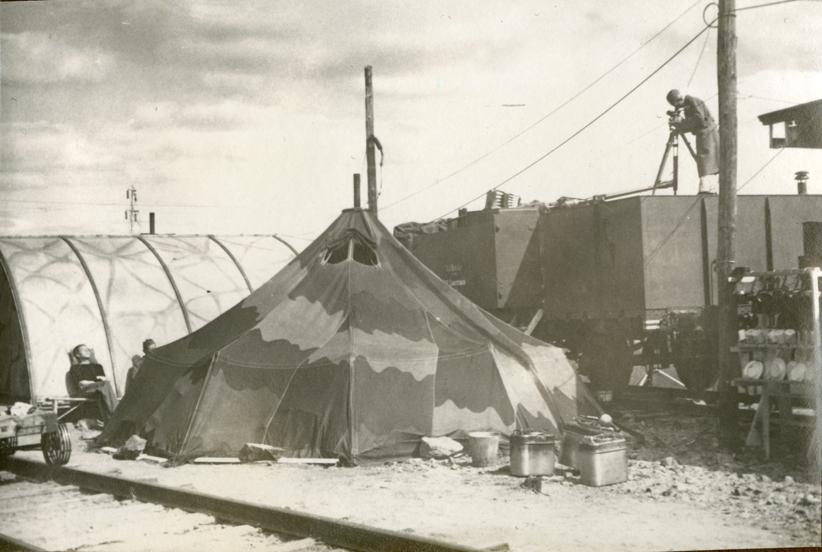 Titel: Ett tält och Agrellhydda intill järnvägsspår.