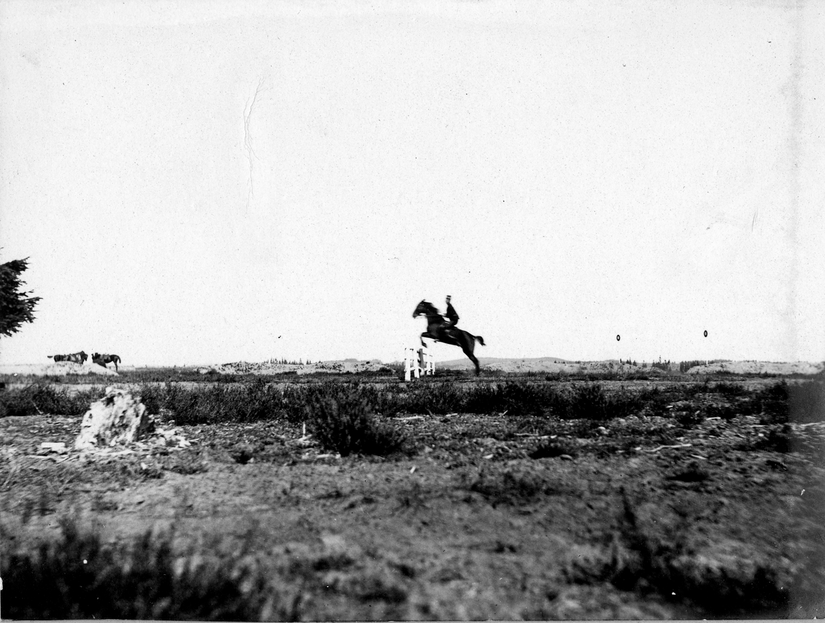 Titel: Soldat till häst rider över fältet.