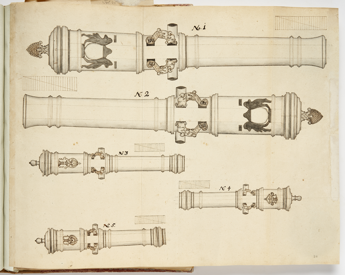 Avbildning av eldrör från fästningen i Nyen, ur en volym som dokumenterar artilleritroféer i fästningarna i Ingermanland och Kexholm, daterad 1691.