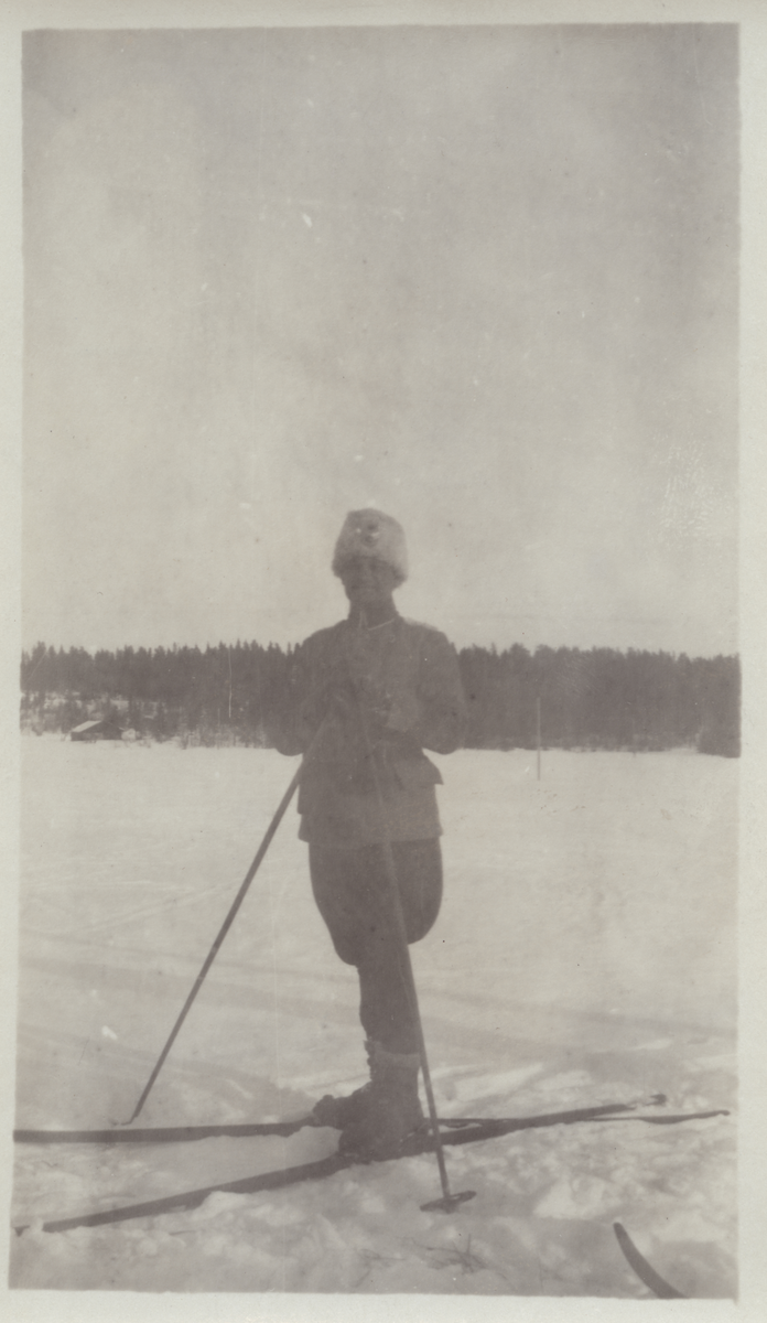 Titel: Bataljonschefen Falkenberg från Första Livgrenadjärregementet I 4 på skidor.