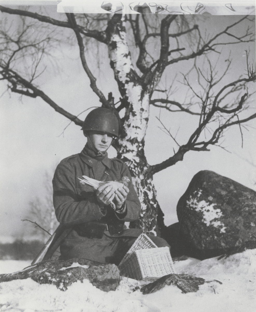 Soldat från signaltrupperna håller brevduva, duvlåda på marken vintertid.
