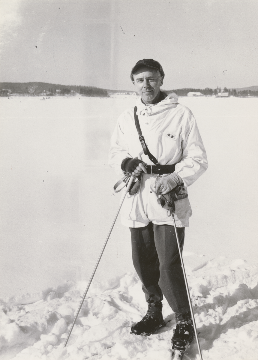 Stig Leijonhufvud på skidor, Intendenturfältövning Korpolombolo, vinter 1958.