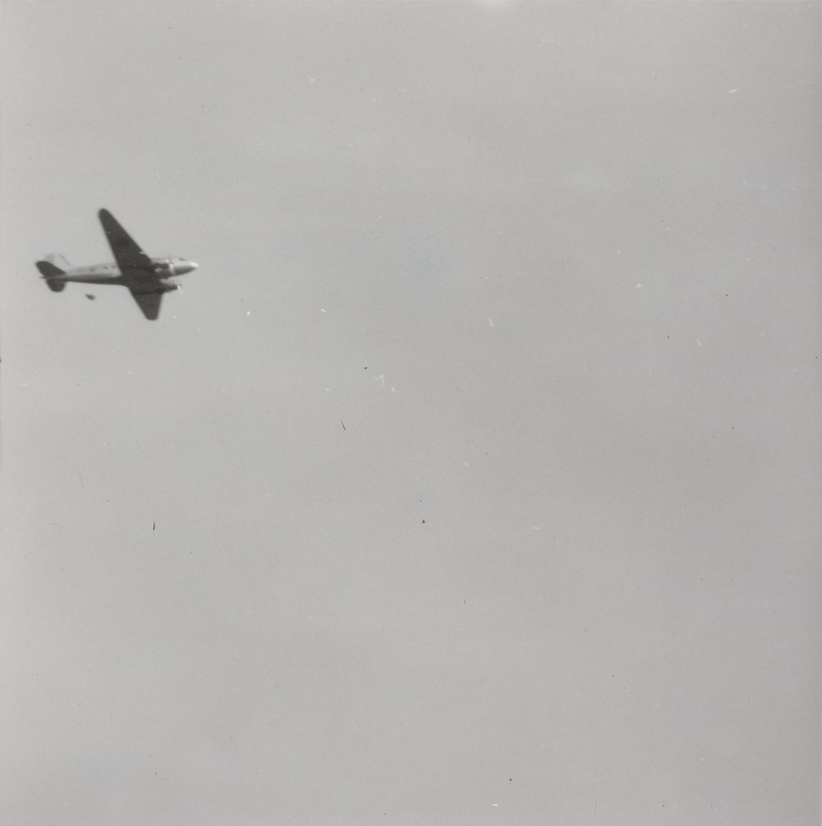 Fallskärmshopp från transportflygplan Tp 79 Douglas Dakota (C47), Skånemanövern hösten 1958.