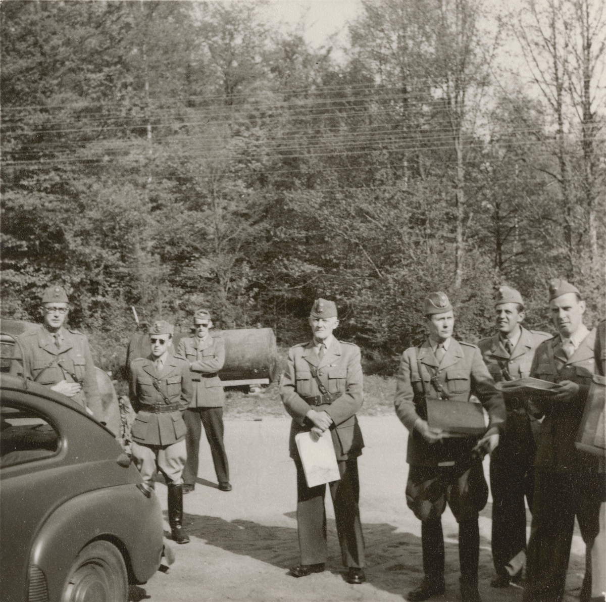 Grupp står vid Volvo PV-personbil, Intendenturfältövning våren 1957.