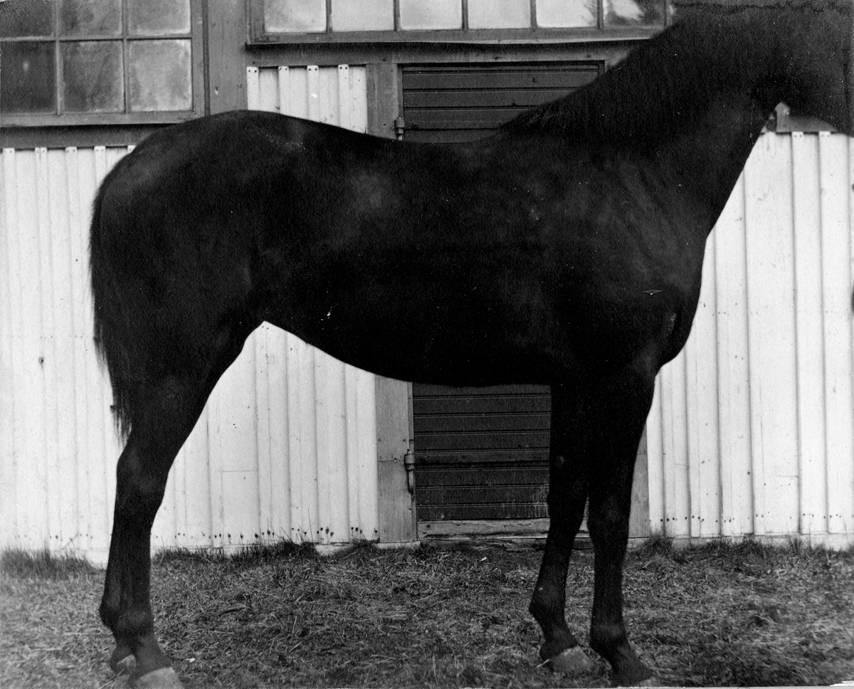 Titel: En häst framför en byggnad.