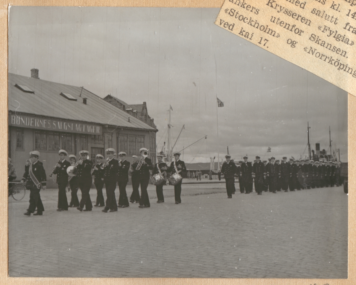 De svenske krigsskipene kom till Trondheim presis kl 14.30 i går, og bie hilst med salutt fra Kristiansten. Kryssaren Fylgia gikk till ankers utenfor Skansen. Jagerne Stockholm og Norrköping la till ved kl 17.