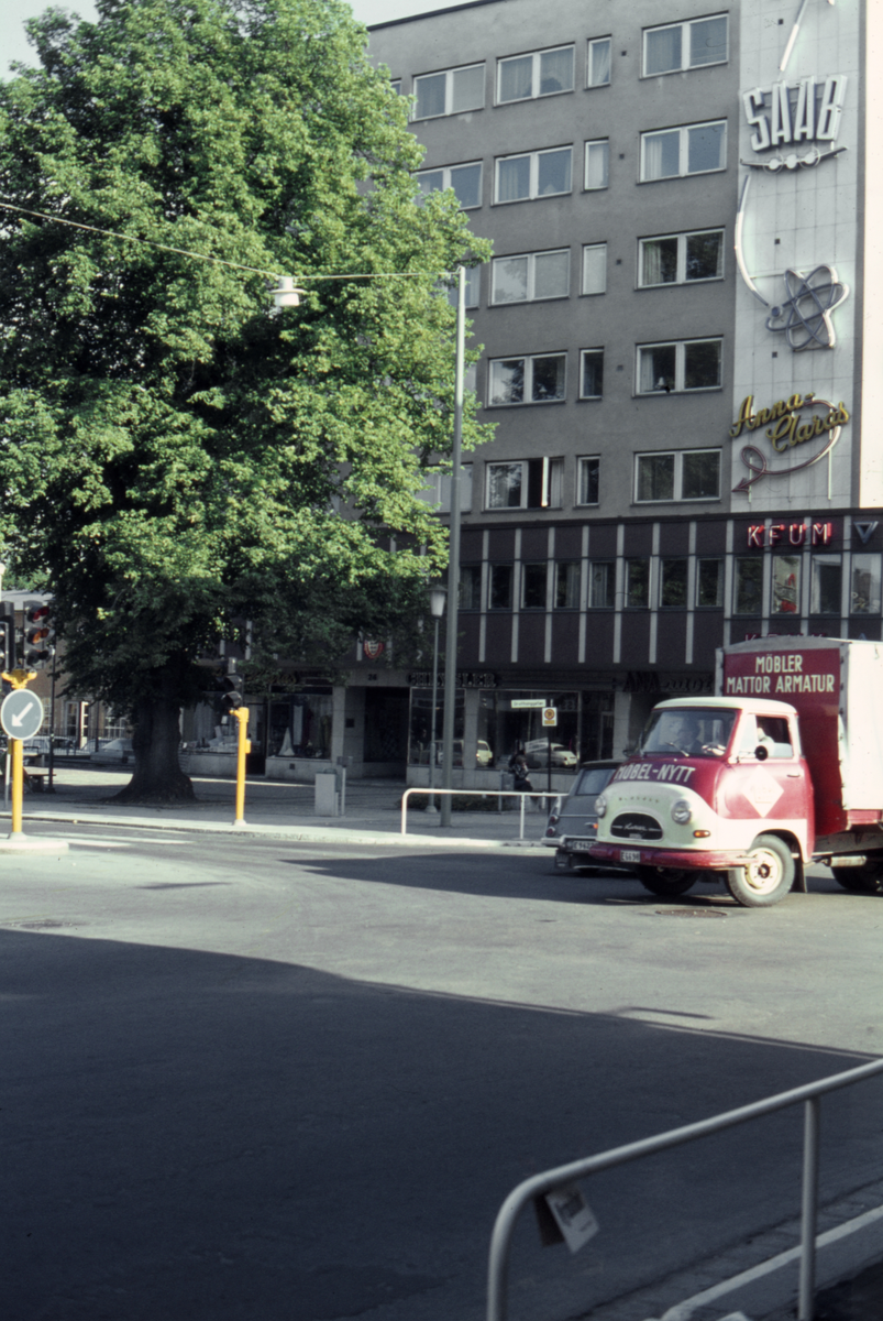 Sedan mitten av 1950-talet markera fastigheten Drottninggatan 24 korsningens sydöstra hörn mot S:t Larsgatan i Linköping. Fasaden annonserar husets initiativtagare i föreningarna KFUM och KFUK. Även tydligt markerat var man fann den långvariga textilbutiken Anna-Claras och vägen mot SAABs utlokaliserade kontor. Foto omkring 1965.
