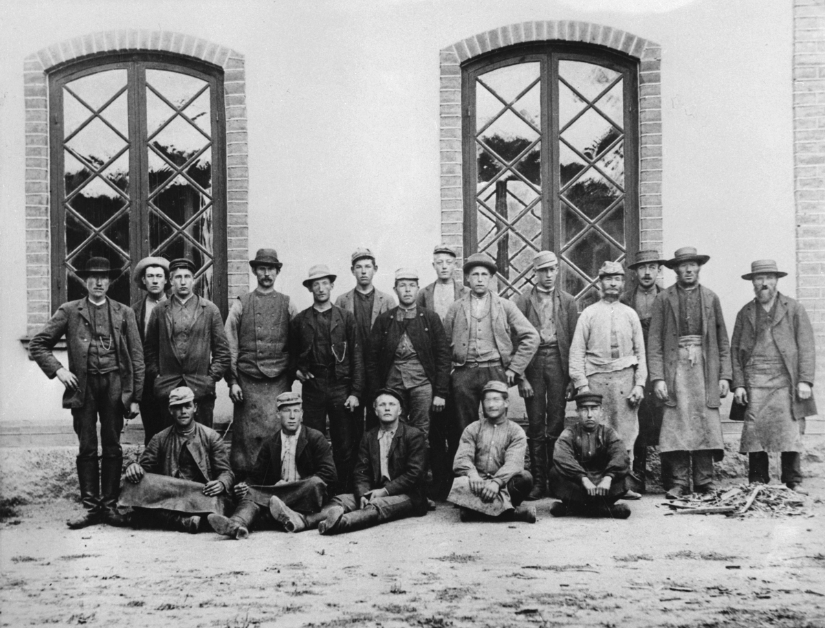 Delar av arbetsstyrkan vid godset Sturefors 1897. Uppenbart folk i yttre tjänst och källorna anger några tänkbara yrkesmän bland egendomens inspektorer, rättare, fin- och grovsmeder och kuskar. Repro.