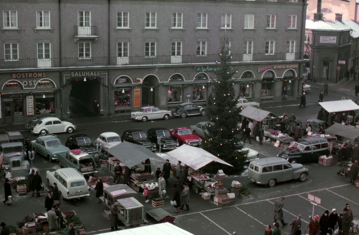 Torghandel på Trädgårdstorget i Linköping, vilket kan väcka lust till en historisk betraktelse. Torget lades ut som just "Trädgårdstorget" vid mitten 1800-talet för att skapa en handelsplats vid sidan av Stora torget och i viss mån Hospitalstorget. En tid var handeln av köttvaror hänvisad till det nya torget och det kom att benämnas som "Köttorget". Striktare hygienkrav och Saluhallens tillkomst gjorde Trädgårdstorget till ett grönsakstorg, vid sidan av försäljning av fisk. I skiftet återställdes inte torgets namn utan istället kom det att kallas Tanneforstorget. Beteckningen används exempelvis på stadens officiella stadskartor från omkring förra sekelskiftet. För mer sentida Linköpingsbor kan "Tanneforstorget" tyckas varit ett märkligt namn men har sin förklaring i platsens historiska anknytning till Tannefors, ett par kilometer sydost om centrala Linköping. Här låg i äldre tid infarten till staden från Tannefors-hållet och den stadsport med tullstation som gick under namnet "Tannerforstullen". Bilden visar dock en helt annan tid, hösten 1963.