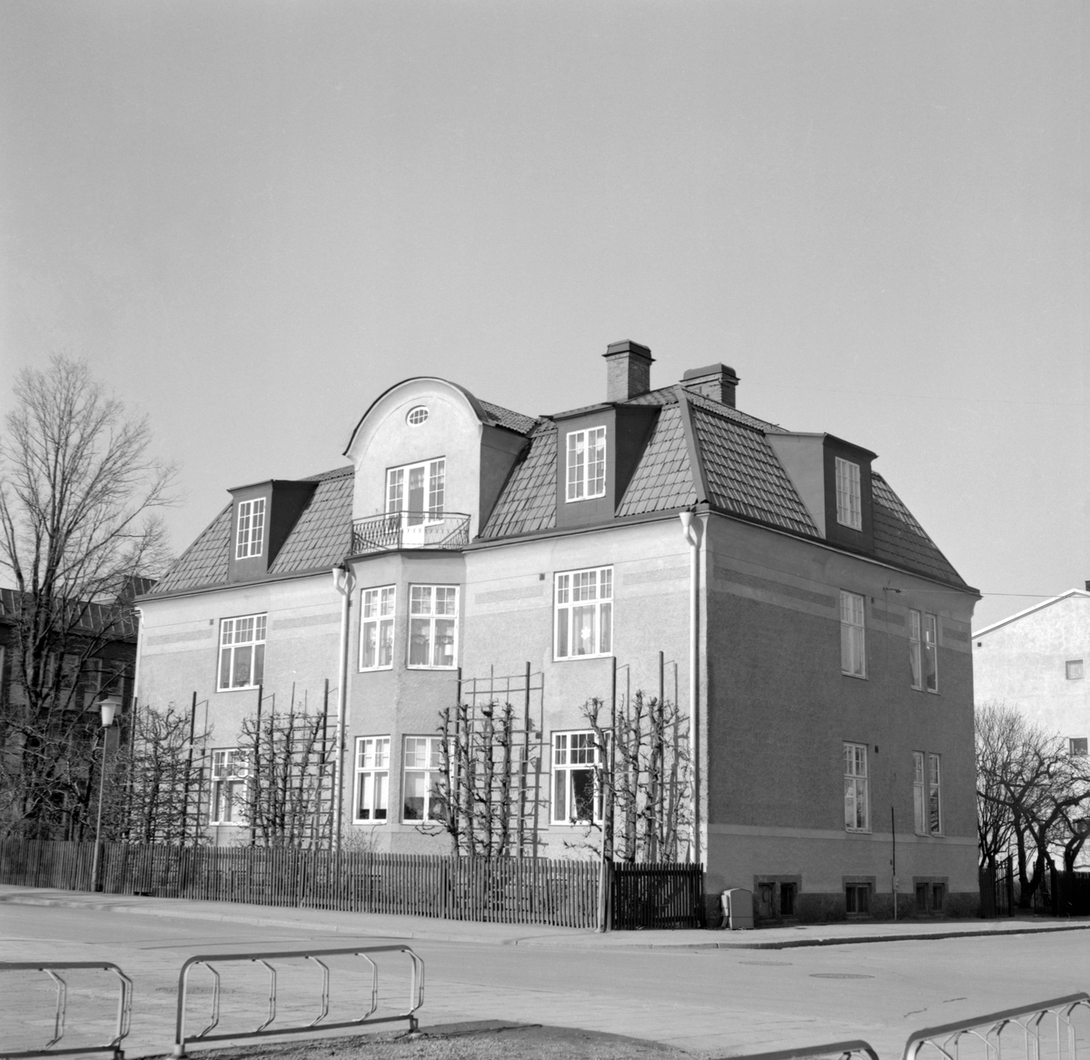 Vid tiden för förra sekelskiftet hade den växande utbredningen av Linköpings centrala delar nått Linnégatan i söder. Vid tiden lades tomter ut i det så kallade Munkgärdet, där omgivningen då var i det närmaste obebyggd. När kvarteren mot dagens Torkelbergsgatan väl var fyllda med hus kom utbredningen att stanna av. Gamla Idrottsplatsen, Folkungavallen och det planerade Tinnerbäcksbadet stod i vägen för bostadsändamål. I hörnet av Repslagaregatan och Tinnerbäcksgatan (senare omdöpt till Torkelbergsgatan) lät folkskoleläraren Oscar Löwendahl uppföra bildens fastighet. Lagfarten löstes i början av år 1912 och huset stod klart kort därefter. Sedan en tid rivet till förmån för ett större flerfamiljshus. Foto 1974.