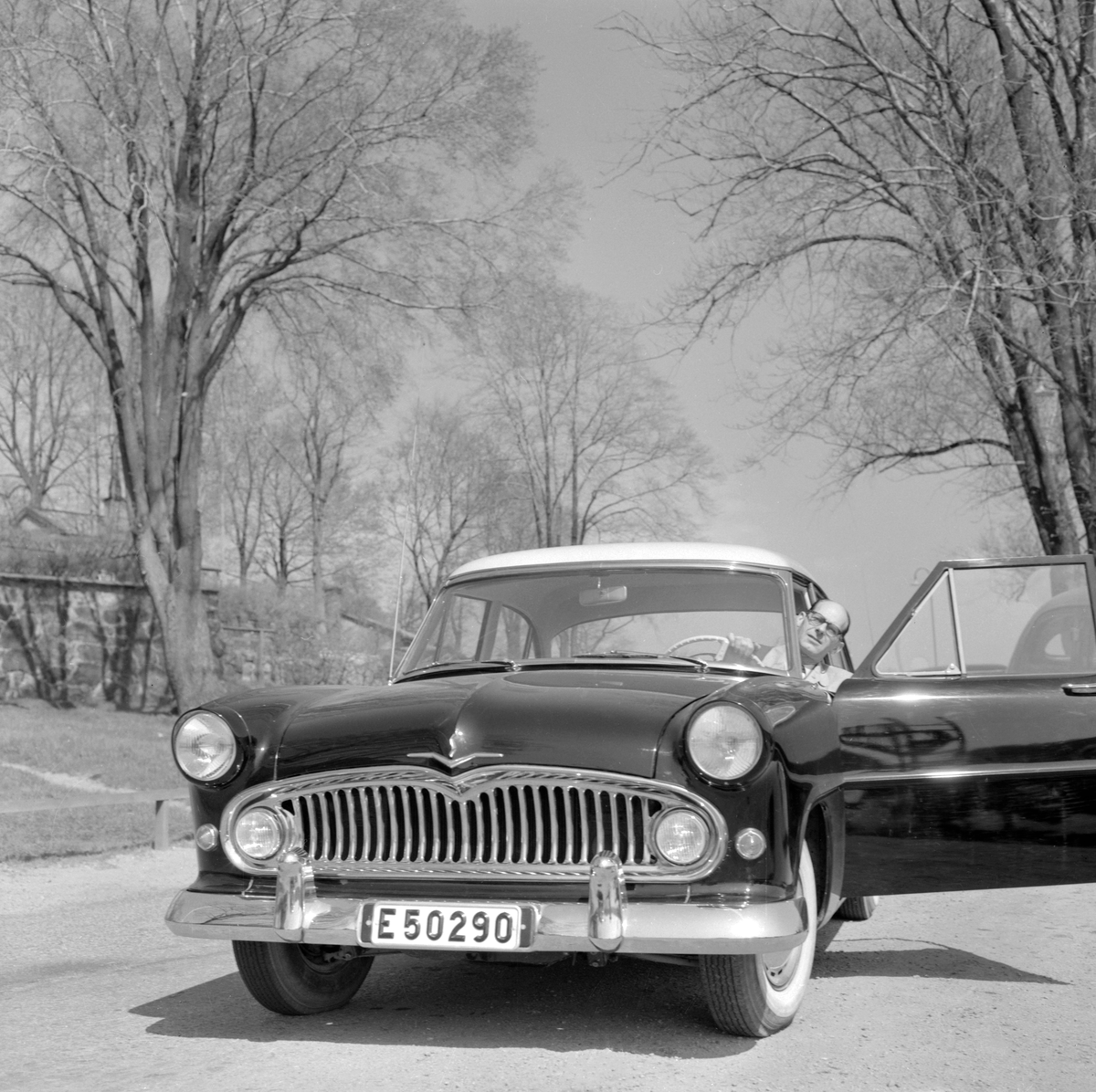 Stig Halldén, stolt ägare till en sprillans Ford Vedette. Hemmahörande i Linköping men i stunden på besök i Stockholm. Foto 1957.