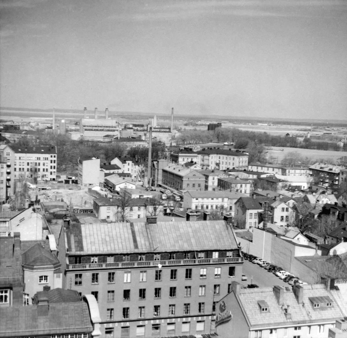 Parti av Linköping 1968. Vy mot norr från Sankt Larskyrkans torn. Närmast ses Östgöta Correnspondentens tidningshus i kvarteret Badhuset. Industrianläggningen i bildens mitt är Lantmännens mjölkcentral utmed Kungsgatan. I fonden reser sig stadens värmeverk.