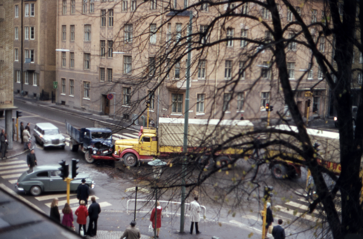 Dramatik från det egna fönstret. Sammanstötning mellan lastbilar i korsningen Drottninggatan-S:t Larsgatan i Linköping. Foto omkring 1975.