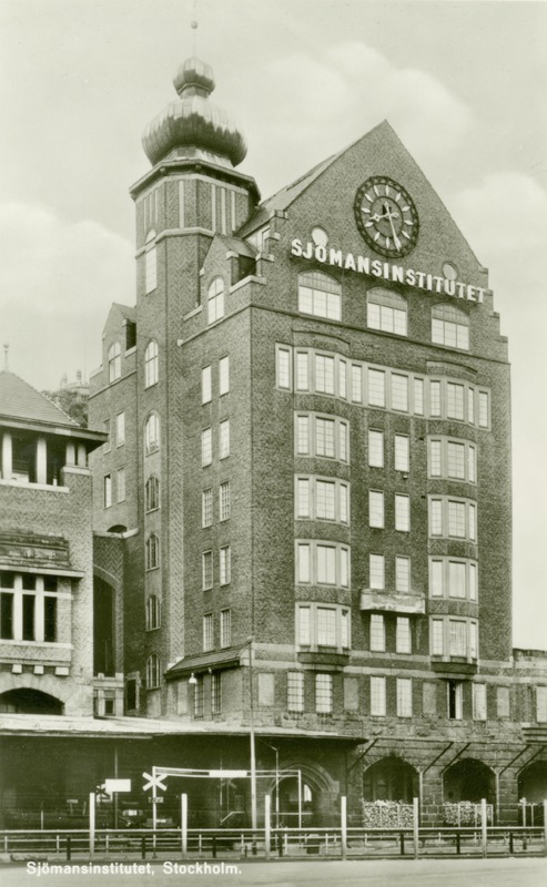 Vykort av ett svartvitt fotografi som visar Sjömansinstitutet på Södermalm i Stockholm. På bilden syns byggnadens fasad ut mot Katarinavägen. Längst ner på vykortets framsida står det tryckt i vita bokstäver "Sjömansinstitutet, Stockholm". På baksidan står det tryckt " Svensk tillverkning: EXTRA PRIMA Fotografi".