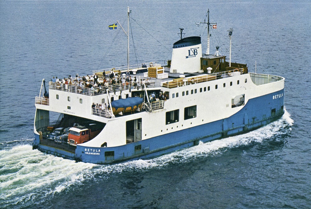 Vykort av ett färgfotografi som visar färjan S/S Betula på väg över Öresund i okänd riktning. På däck syns en större mängd passagerare. Ett par bilar och en lastbil syns på bilddäck, i aktern.
