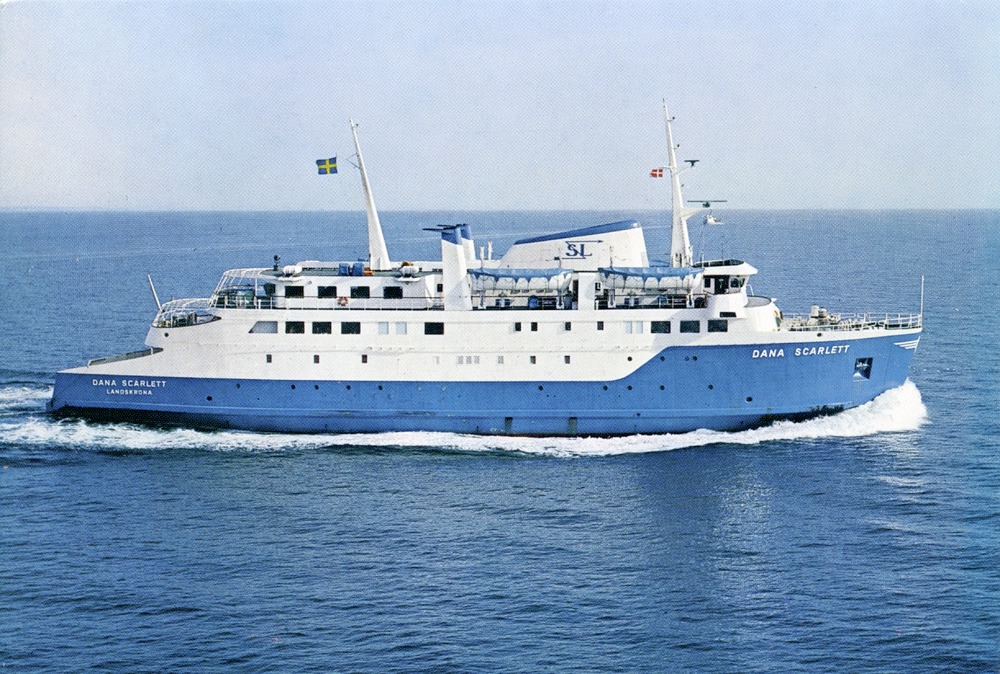 Vykort av ett färgfotografi som visar färjan M/S Dana Scarlett på Öresund. På vykortets baksida står det tryckt "M/S Dana Scarlett (1964)", "POSTCARD SCANDINAVIAN FERRY LINES", "SKANDINAVISK LINIETRAFIK A/S", "København - Landskrona" samt information om fartygets längd, bredd, höjd med mera. Vykortet är inte postgånget.
