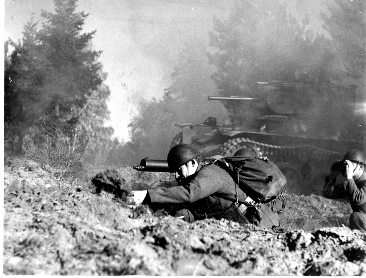 Man framför kulspruta, stridsvagn i bakgrunden.