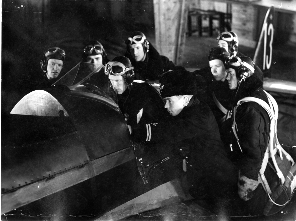 Titel: Piloter med flygarhuvor får instruktion i flygplan i hangar.