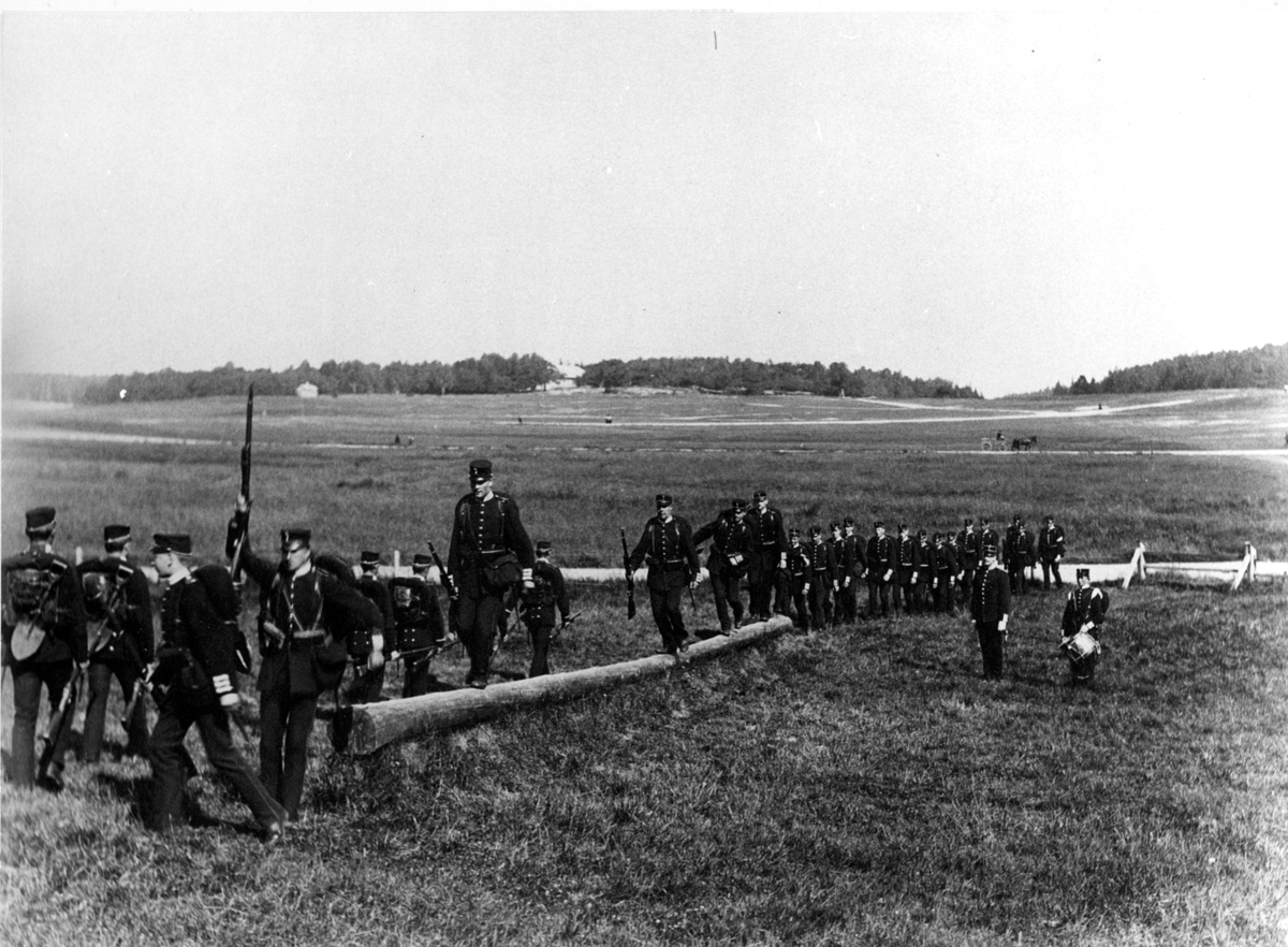 Titel: Svea livgarde balanserar på stock.