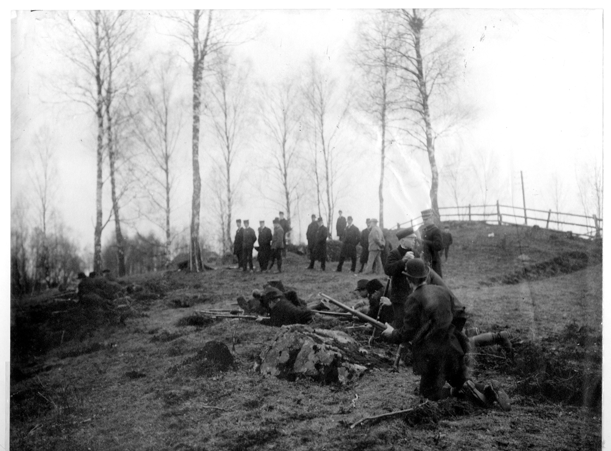 Titel: Civila övar skytte i terrängen under militär ledning.