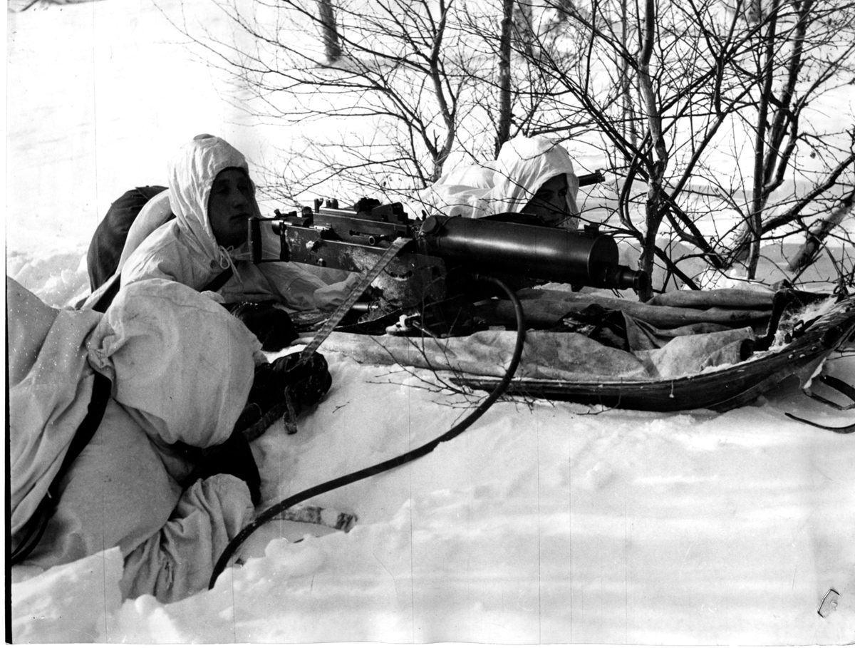 Titel: Tre soldater i snödräkt i ställning vid kulspruta m/36.