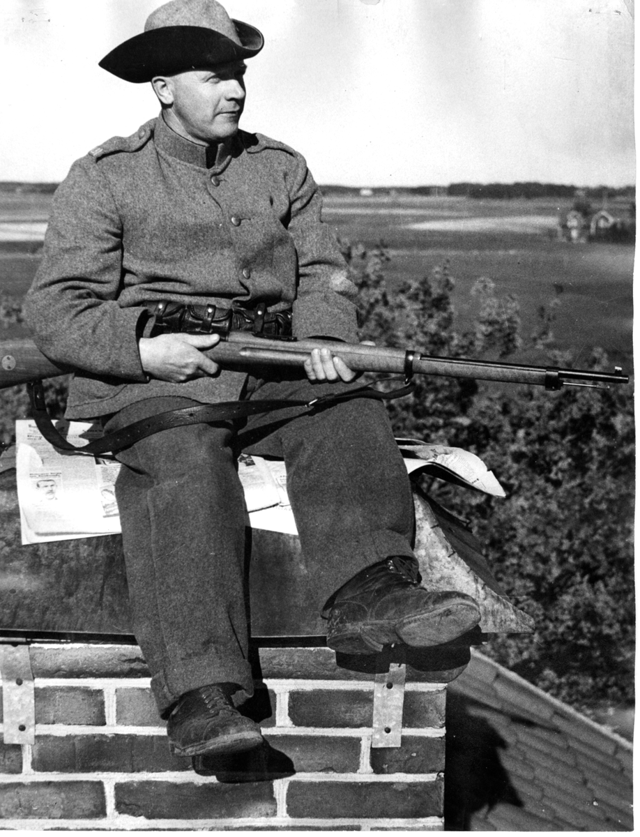 Titel: Soldat i landstormsuniform sitter på skorsten och spanar.