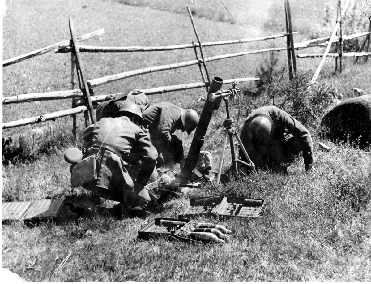 Titel: Granatkastargrupp med 8 cm Grk m/29 vid gärdesgård.
