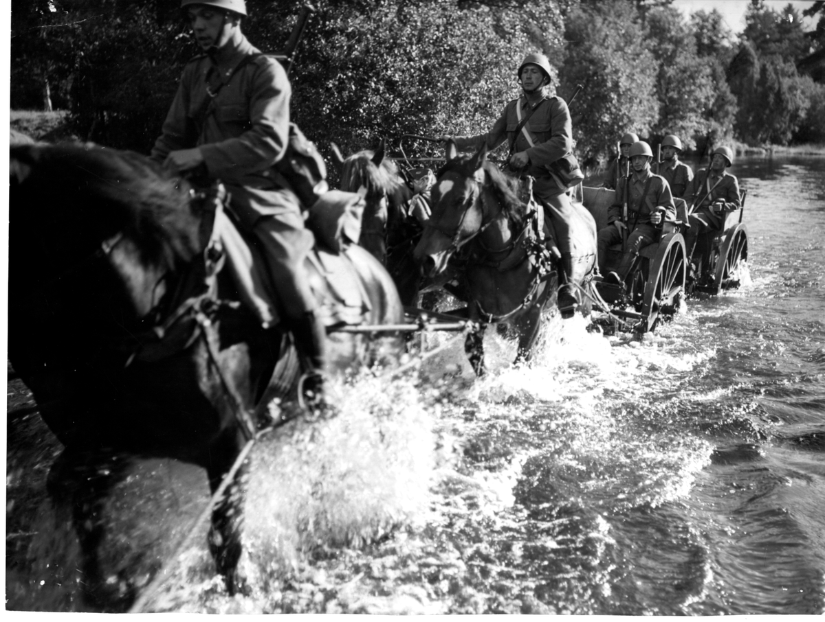 Titel: Artillerispann kör längs vattendrag.