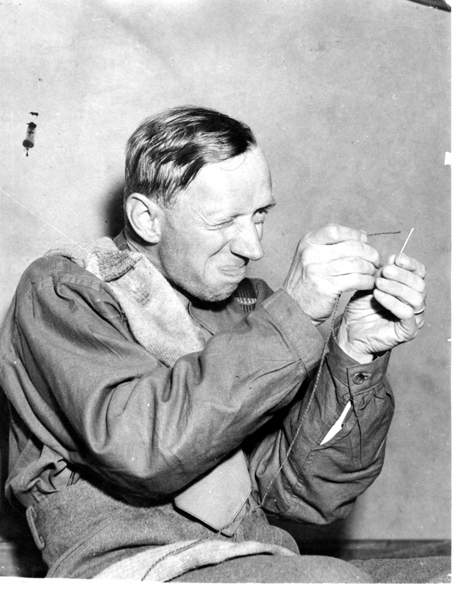 Titel: Man trär garn på synål.