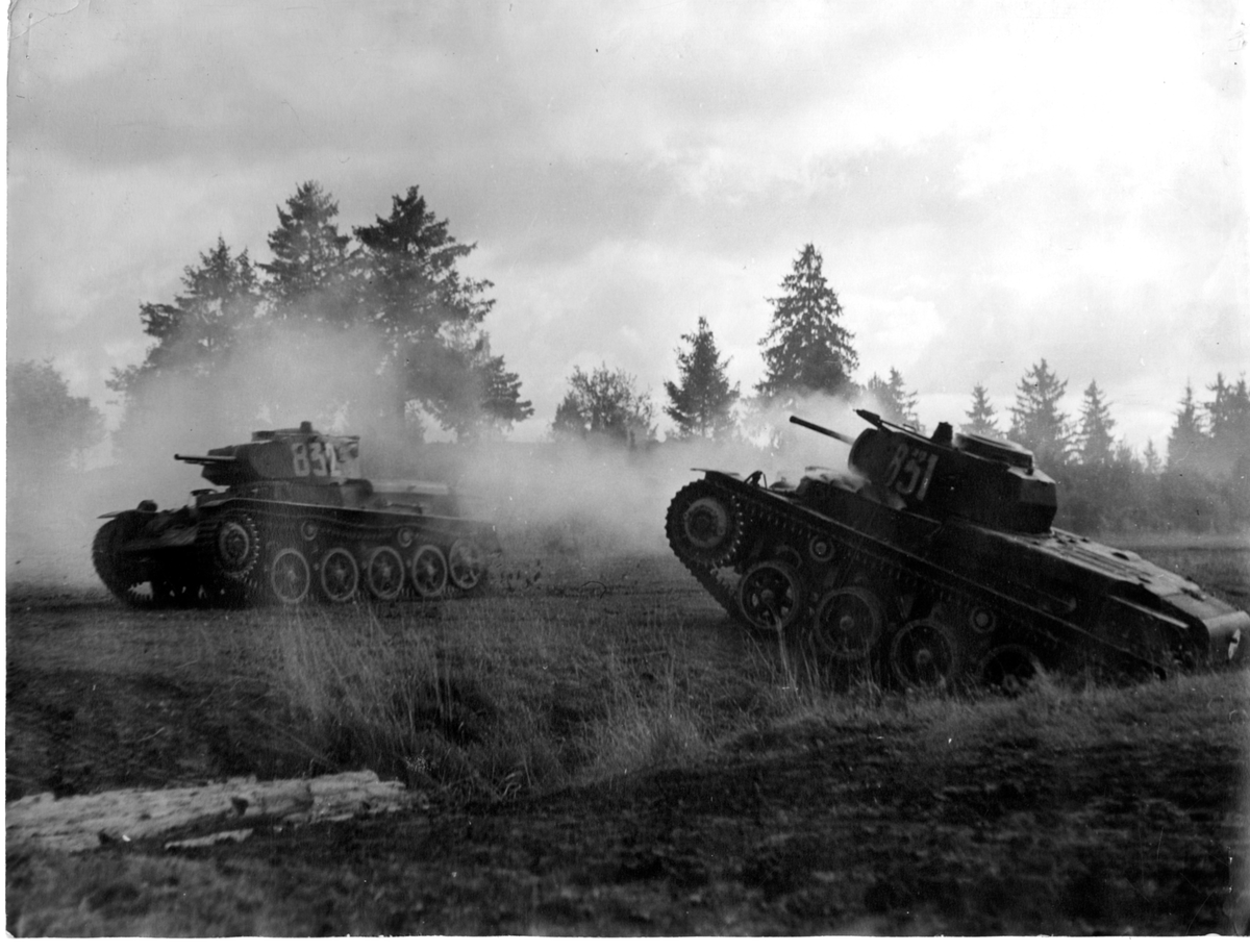 Titel: Två stridsvagnar m/42 på övningsfält.