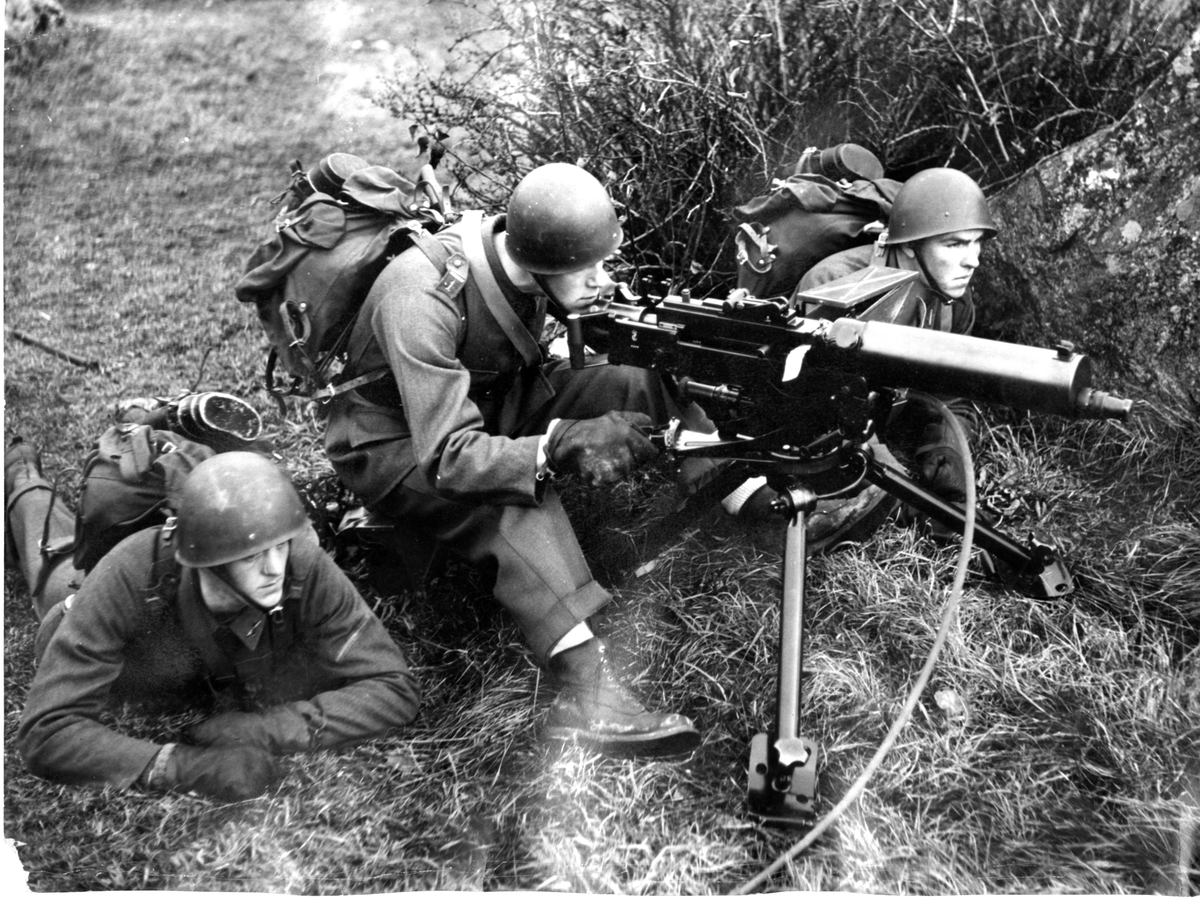 Titel: Tre soldater vid kulspruta m/36.