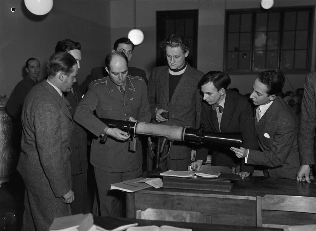 Titel: Frivillig befälsutbildning (FBU). Män samlade kring ett vapen.