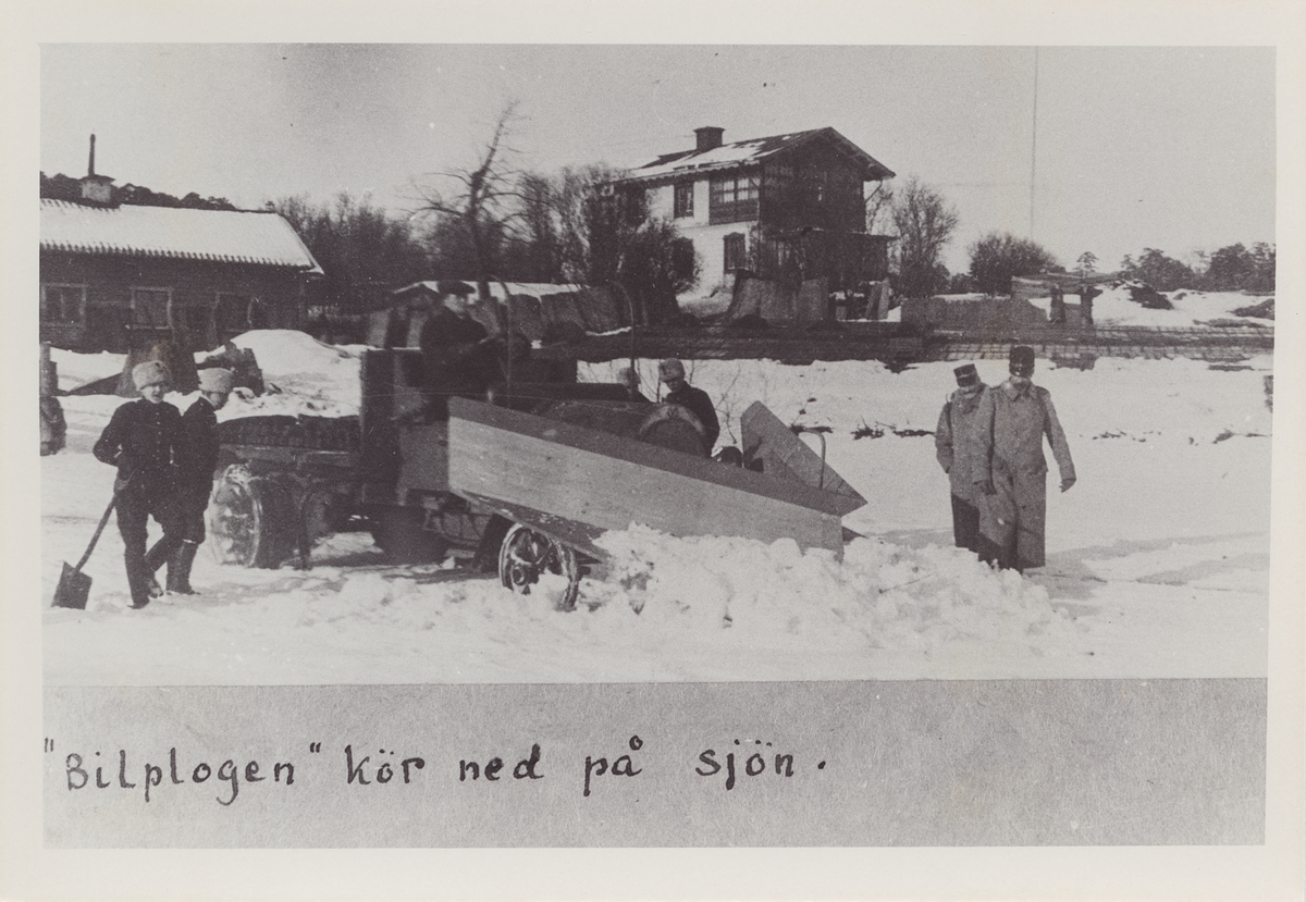 Titel: Snöröjning 1916: Bilplog kör ut på sjön.