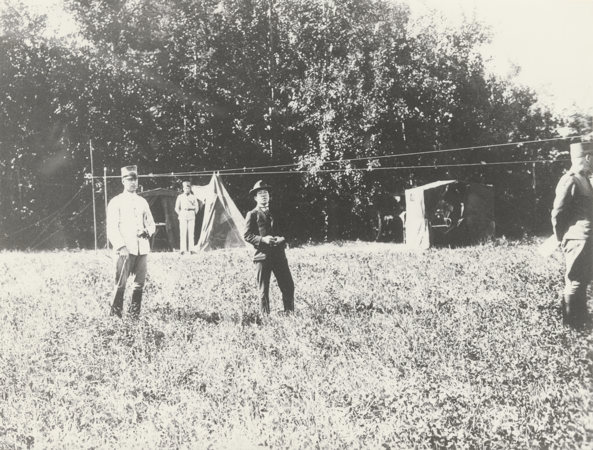 Titel: Signaltrupp spänner upp antenn över fält.