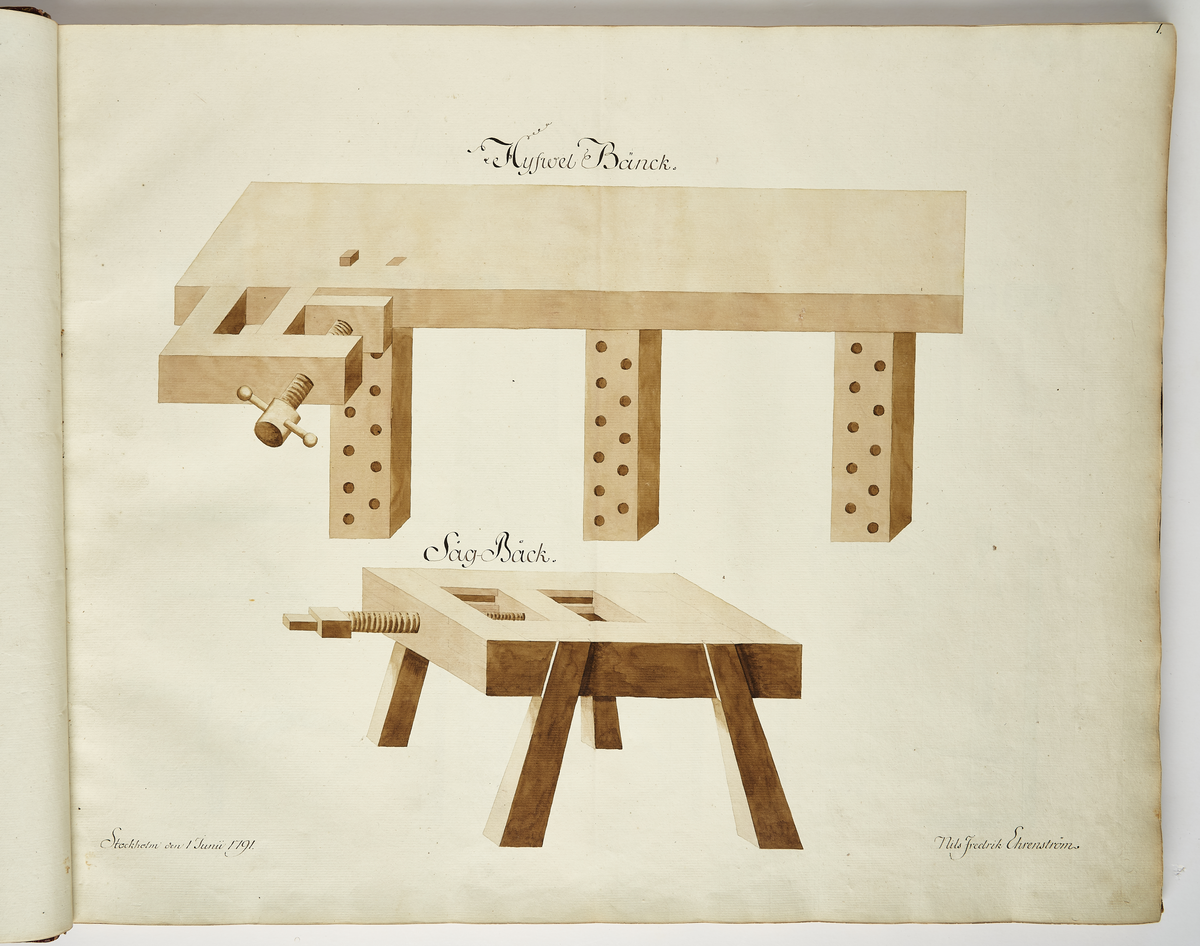 Hyvelbänk och sågbänk, ritning av Nils Fredrik Ehrenström.