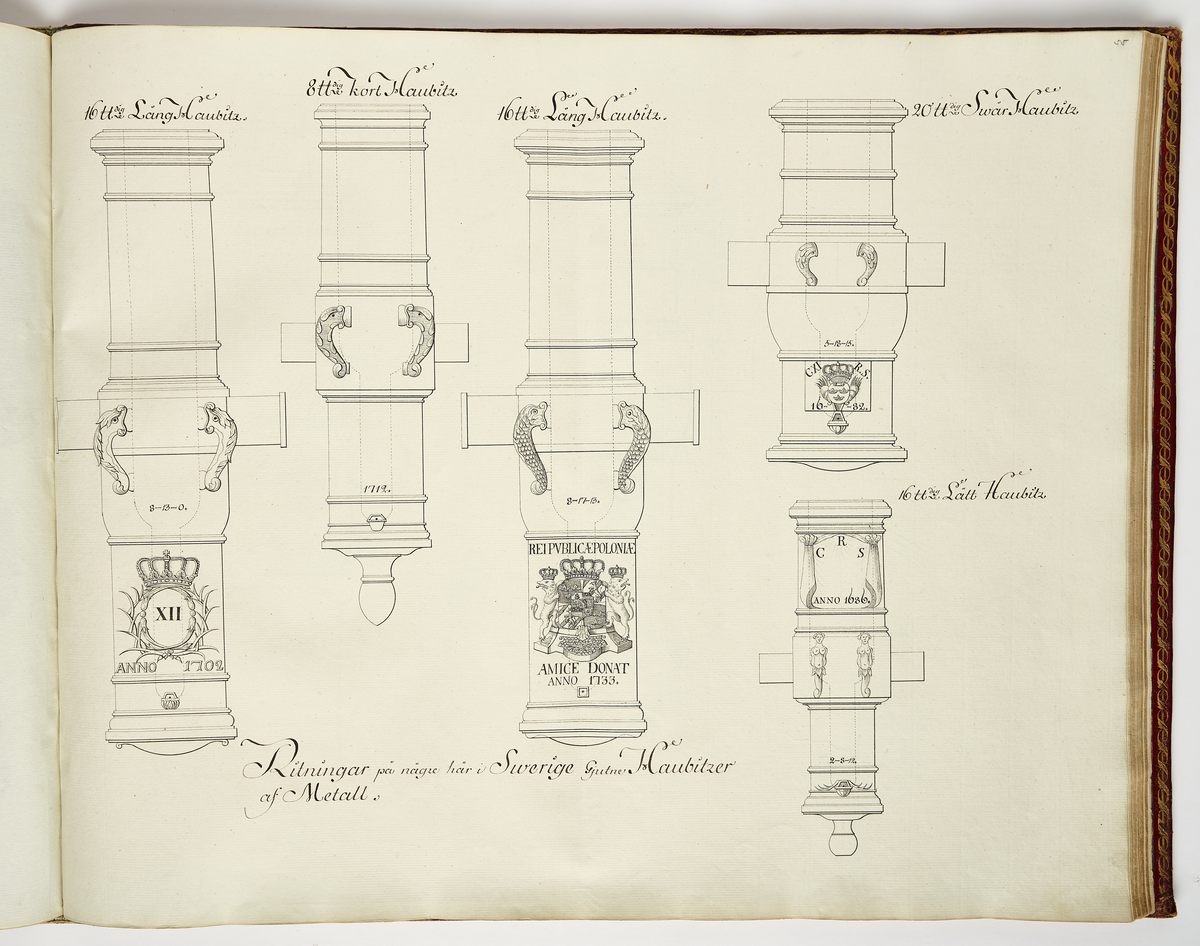 20-pundig, 16-pundiga och 8-pundig haubits, ritning av Nils Fredrik Ehrenström.