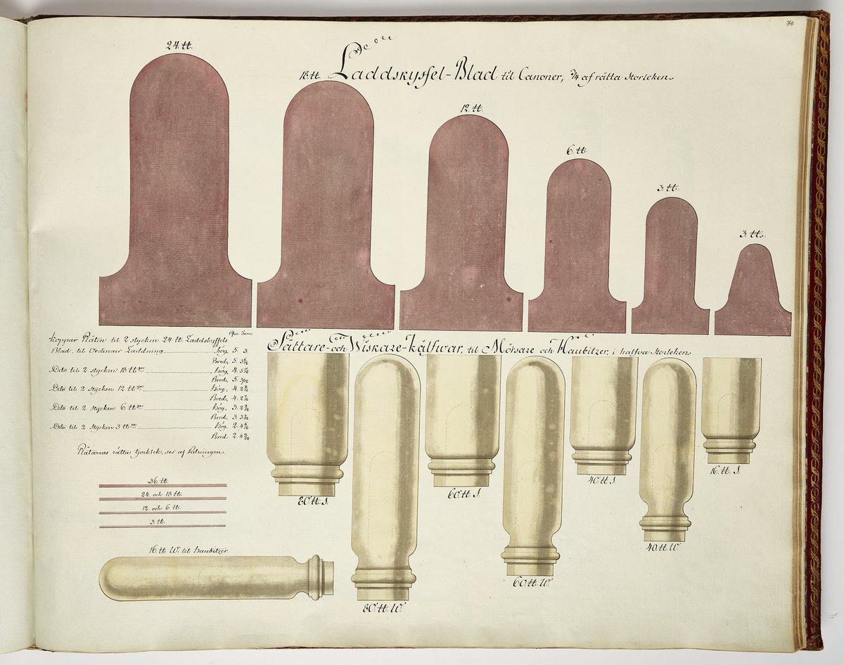 Laddskyffelblad till kanoner samt sättare- och viskarekolvar till mörsare och haubitsar, ritning av Nils Fredrik Ehrenström.