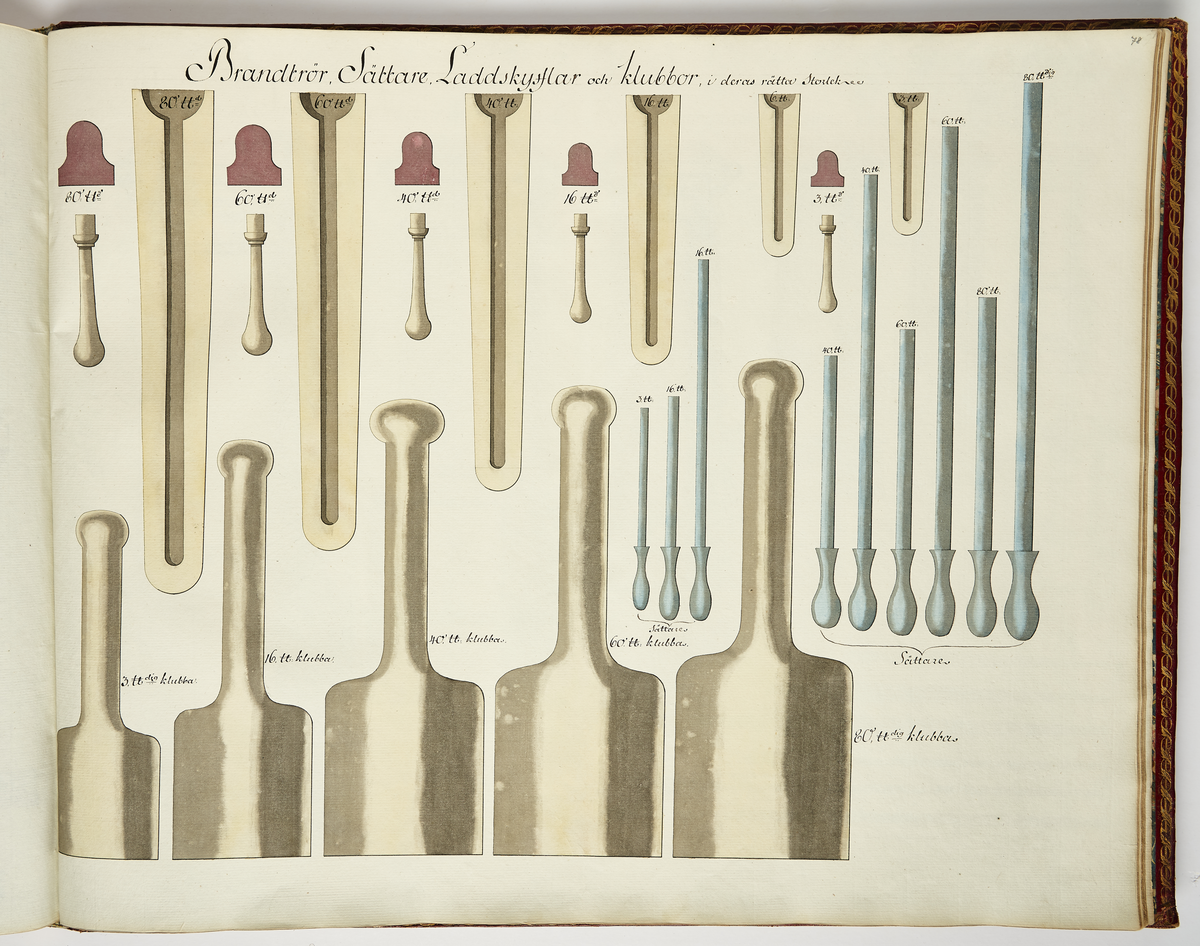 Brandrör, sättare, laddskyfflar och klubbor, ritning av Nils Fredrik Ehrenström.