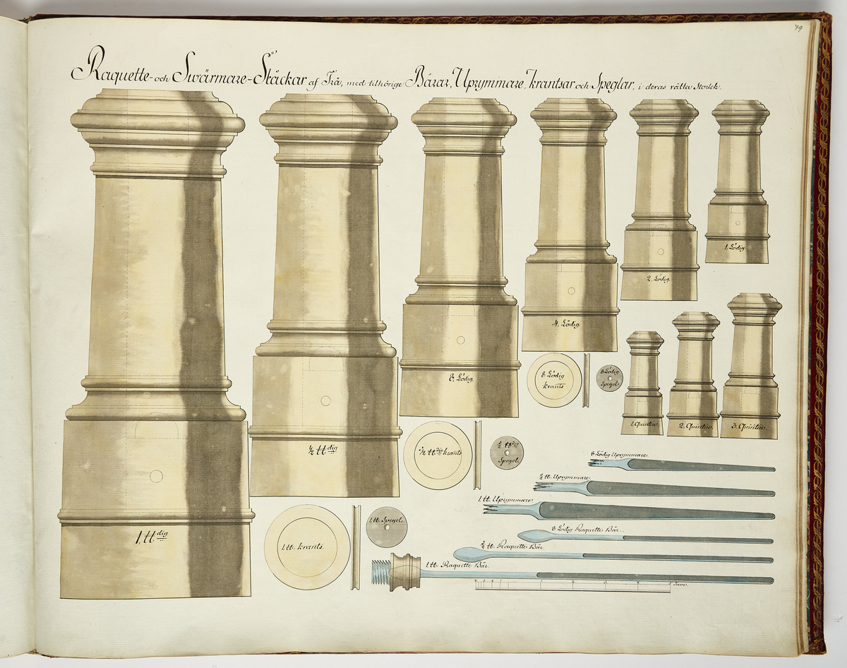 Raquette- och svärmarestockar med tillhörande bårar, upprymmare, krantsar och speglar, ritning av Nils Fredrik Ehrenström.