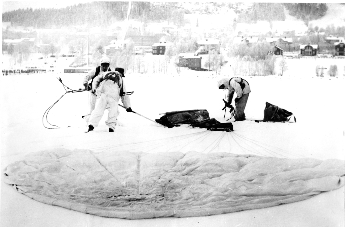 Titel: Tre fallskärmsjägare i vinteruniform har landat på sjöis med utrustning och pulka.