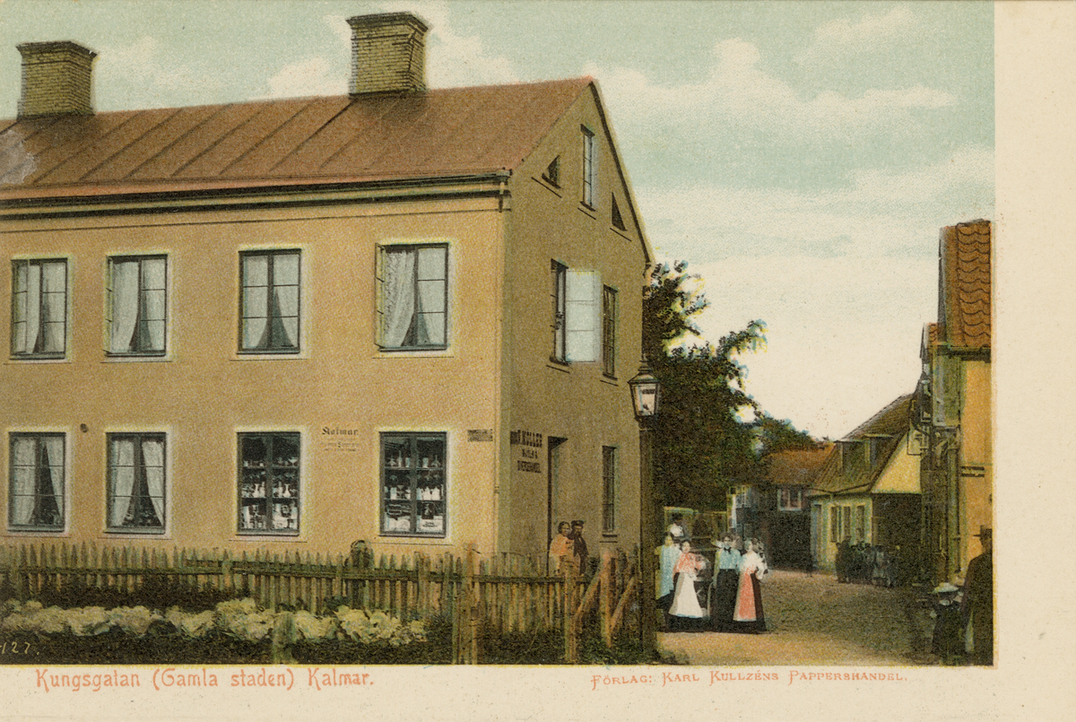 Kolorerat vykort med motiv från Kungsgatan i Gamla staden, Kalmar. Möllers affär. Vykortet är numrerat med 427.