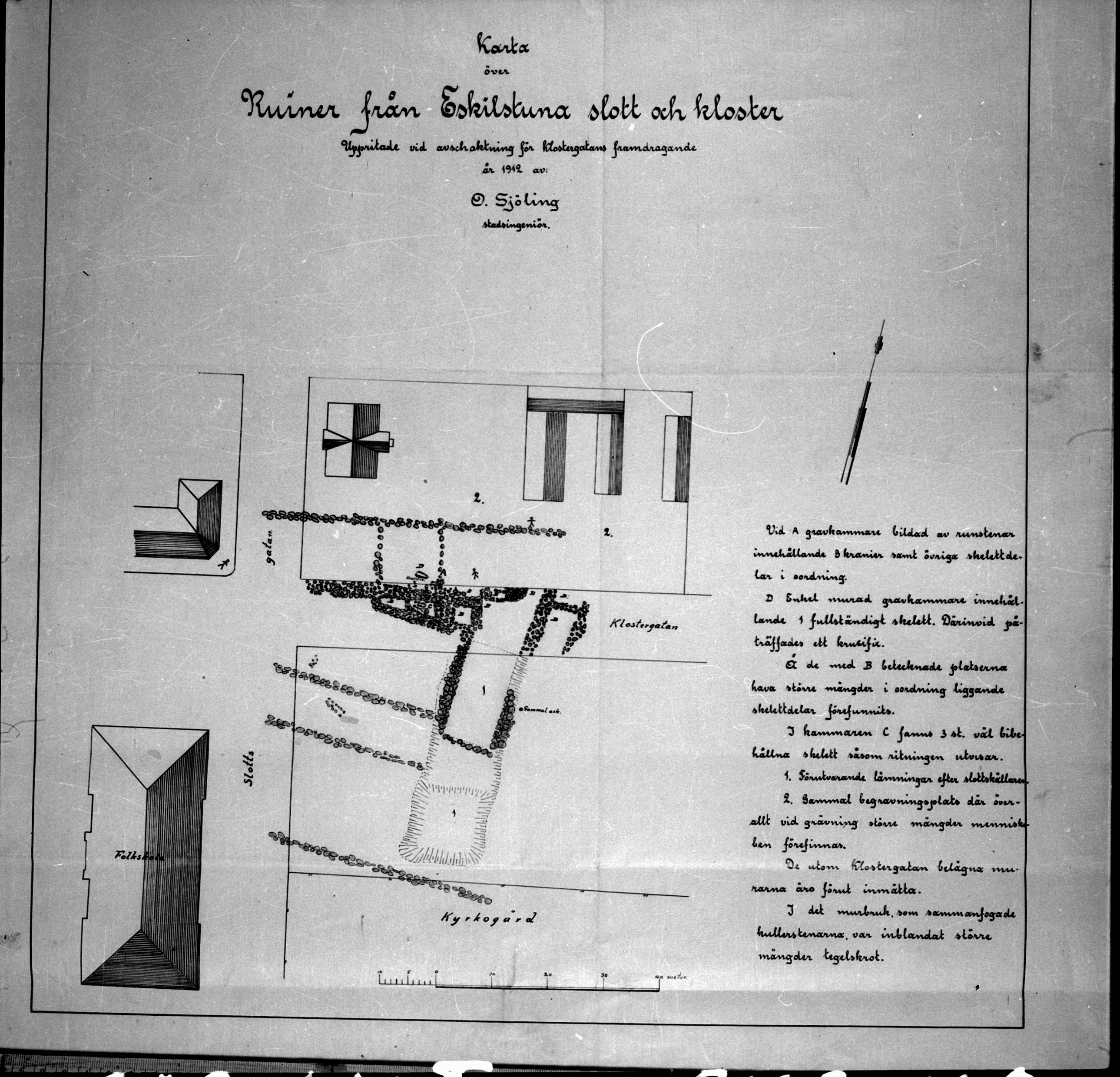 Planritning över lämningarna efter Eskilstuna slott och kloster. Ritningen utförd av Oskar Sjöling.