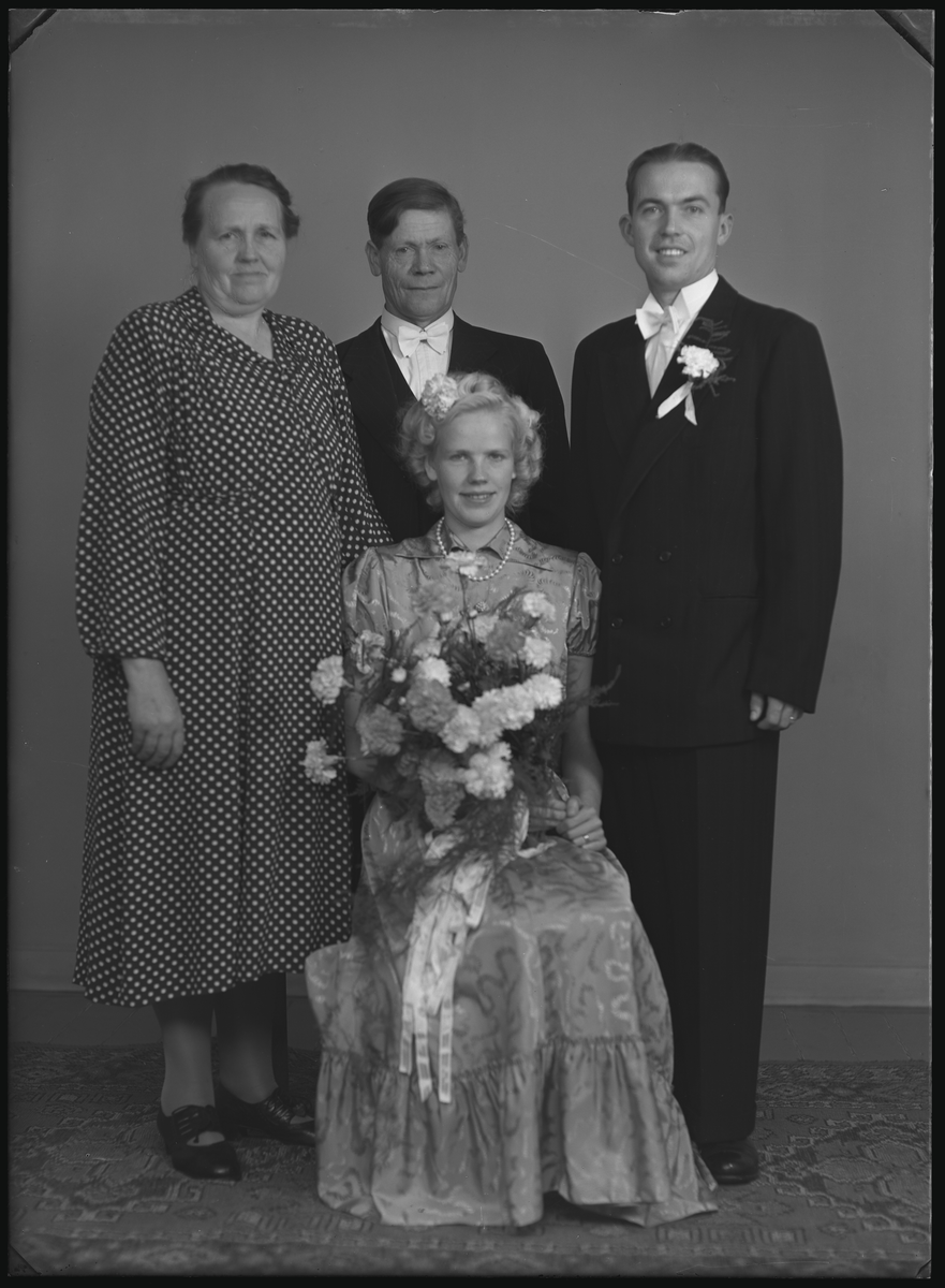 Grupporträtt, fyra personer, bröllop. Elon Ahlbom. Baldersvägen 33, Hallstahammar. Ur Gustaf Åhmans samling.