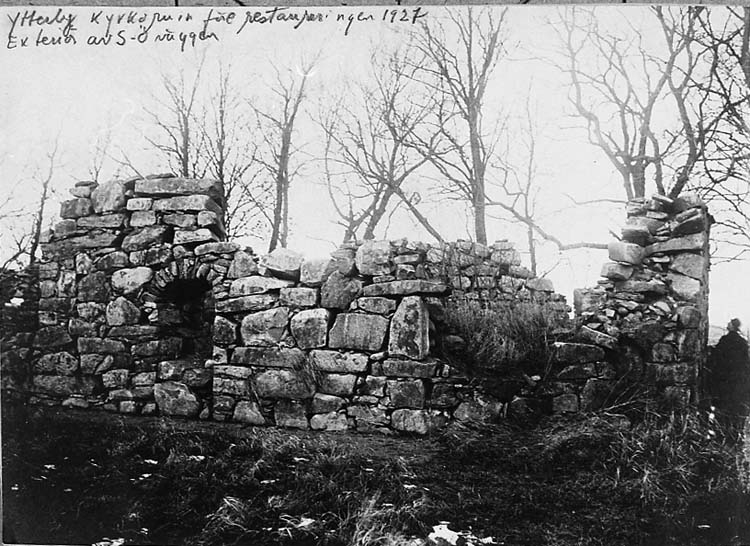 Medföljande text: "Ytterby kyrkoruin. Före restaureringen 1927. Exteriör av SÖ väggen".