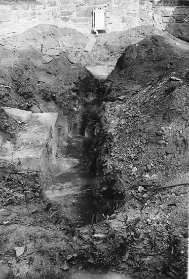 Medföljande text: "Ytterby kyrkoruin 1928. Mot NV. I förgrunden t. vänster triumfbågmuren. Längre bort mot Ö skymtar rester av korets stor yttermur. Foto av Tell 1928".