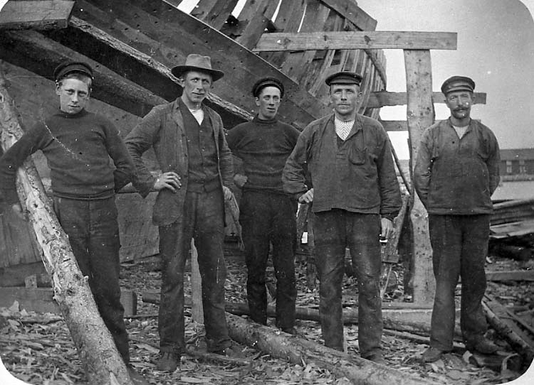 Medföljande text: "Bild från Djupviks varv på Tjörn. På bilden syns från vänster: Gustav Johansson, Adolf Johansson, Johan Johansson, Albin Johansson och Albert Johansson (Gustaf, Adolf och Albin är bröder). I bakgrunden fiskebåt unde byggnad (klinkbygge). Bilden tagen 1910-1915. Originalfoto tillhörande Einar Johansson, Djupvik ".