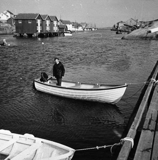 Medföljande text: "Smögen 45 (4,5 m), typ passbåt i plast. Tillverkare: Olsson & Söner Marinservice AB, Smögen. Bilden tagen i Smögen, förmodligen år 1975. Originalfoto tillhörande Gustav Olsson, Smögen".