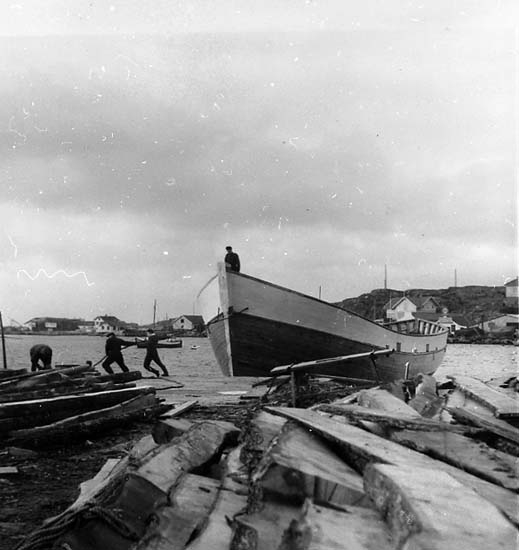 Medföljande text. "Fiskebåten Gulfaxi (byggd 1961, såld till Island) just sjösatt. Ringens Mekaniska Verkstad, Marstrand. (se även R.68:3, R.70:2, R.70:3, R.70:4, 72:2). Originalfoto tillhörande Jean Dahlström, Marstrand".