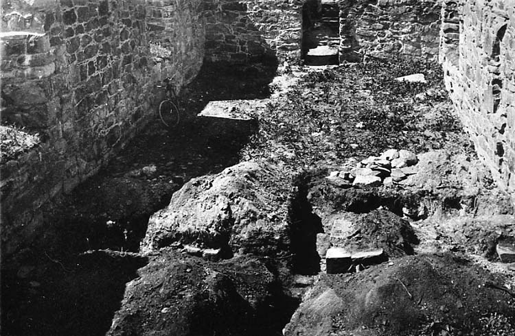Medföljande text: "Ytterby kyrkoruin 1928. Från öster. I förgrunden triumfbågens mur".