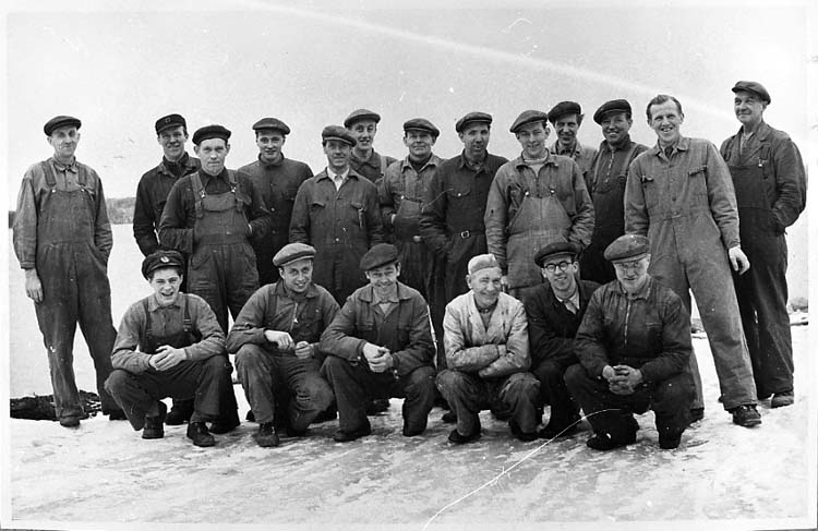 Medföljande text: "Arbetare vid Myrens Mekaniska Verkstad, Strömstad. Främre raden fr vänster: Isaksson, Ivar Antonsson, Verner Augustsson, Karl Olsson, Arne Antonsson och Anders Winter. Där bakom fr v: Gunnar Kilkvist, Erik Antonsson, Ernst Samuelsson, Lennart Andersson, Gunnar Andersson, Frank Olsson, Johan Olsson, Georg Danielsson, Ove Martinsson, Allan Ljungqvist, Melker Martinsson, Erik Ljungqvist och John Simonsson. Bilden tagen i början av 1950-talet. Originalfoto tillhörande Allan Ljungqvist, Strömstad.